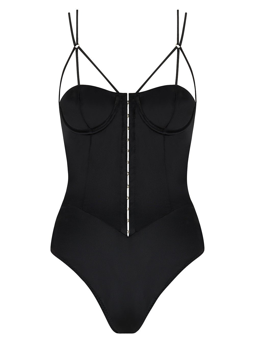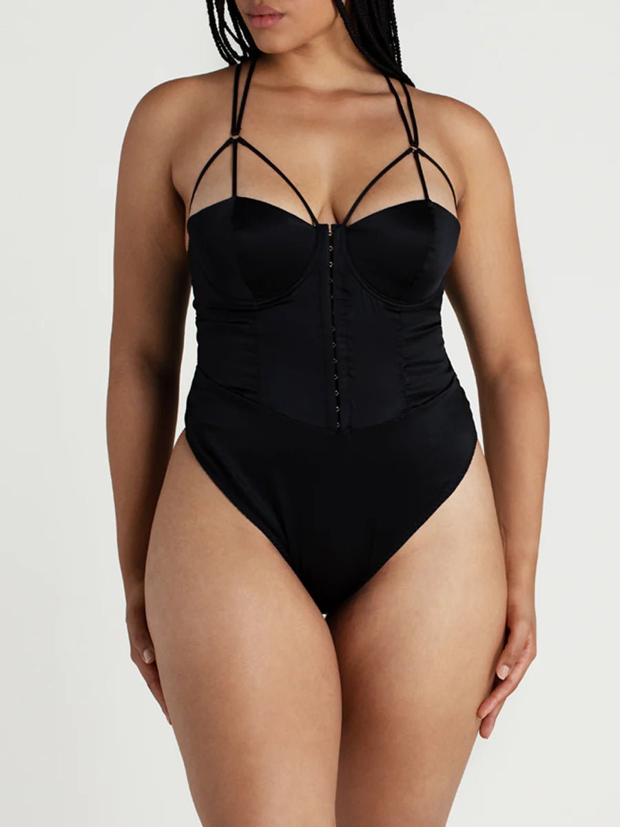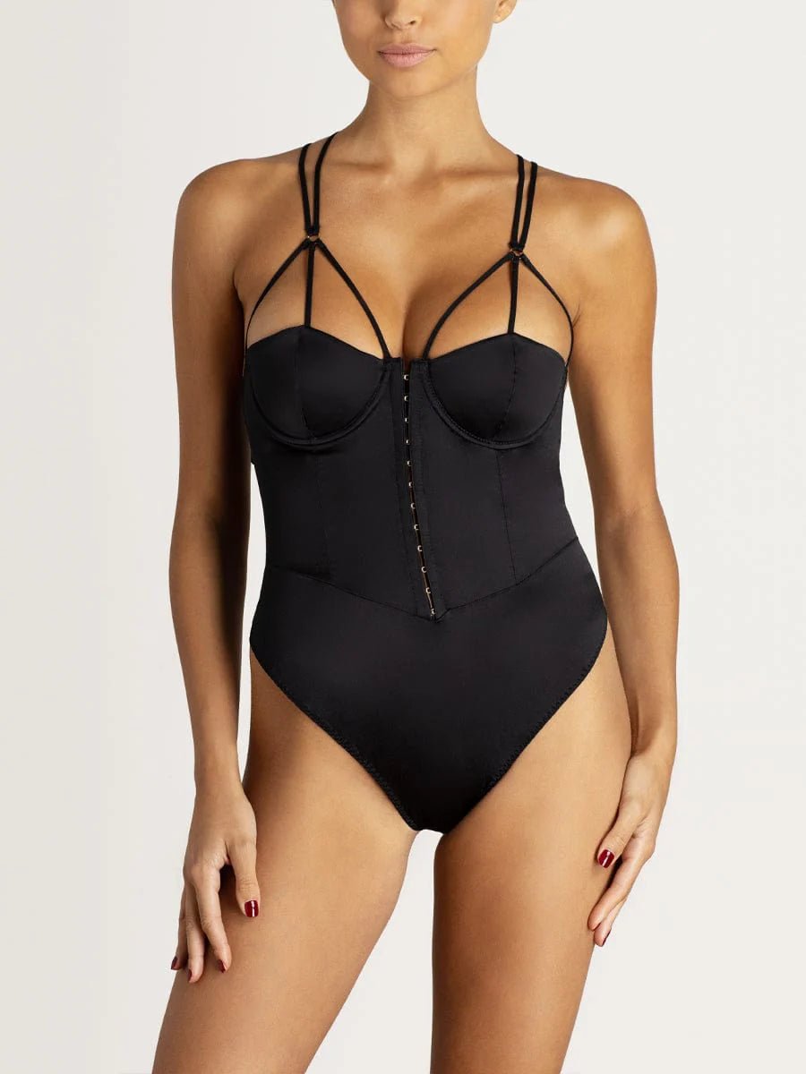 Empowered elegance – De Sylph Bodysuit is opvallend, sensueel en ronduit sensationeel. De bodysuit heeft cups gebaseerd op onze iconische Sylph Half Cup Bra, met een gestructureerde stijl en lineaire bandjes, luxueus gevoerd met zijde. Dertien gouden haak-en-oog sluitingen sieren de voorkant en trekken de aandacht naar het prachtige silhouet dat deze bodysuit creëert. Aan de achterkant behoudt een gedurfde band de opvallende vorm, terwijl een gladde string het strakke, gestructureerde ontwerp compleet maakt. Draag het alleen voor ultieme erotische elegantie.