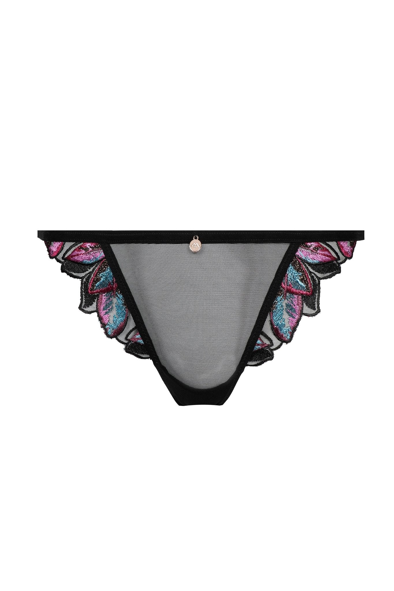 Oiseau de Paradis Brief – Black seduces with sheer black tulle delicately embroidered in exotic floral motifs. Designed with a flattering cut that reveals with daring transparency, this brief embraces the hips with Parisian elegance. Luxurious fabrics and refined detailing make it a bold statement piece within the Oiseau de Paradis collection, perfect for nights of allure.