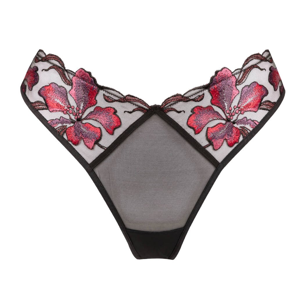 The Dernier Frisson Tanga enchants with sheer black & red mesh delicately embroidered in shimmering golden threads that trace the curves with refined sensuality. The minimal, elegant cut offers a teasing glimpse of skin while maintaining the signature Parisian sophistication of the collection. Refined Atelier Amour detailing completes this seductive essential, designed to pair effortlessly with every piece from the Dernier Frisson line.