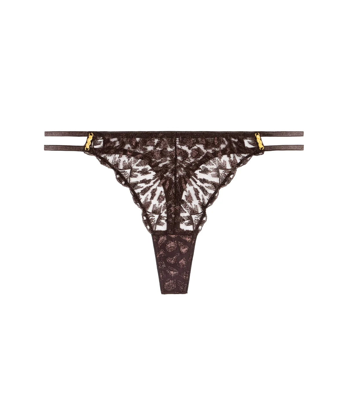 The Crazy in Love Tanga by Aubade is a whisper of seduction, crafted in satin brown lace and sheer tulle. Its low-rise cut and barely-there back offer a daring silhouette, while delicate embroidery and gold-toned accents add a touch of opulence. Designed to pair seamlessly with the matching bras and body, this piece is both provocative and poetic — a celebration of confident femininity.