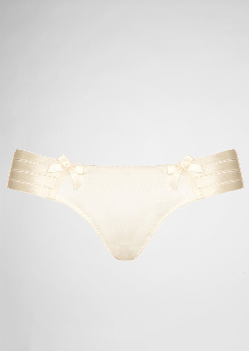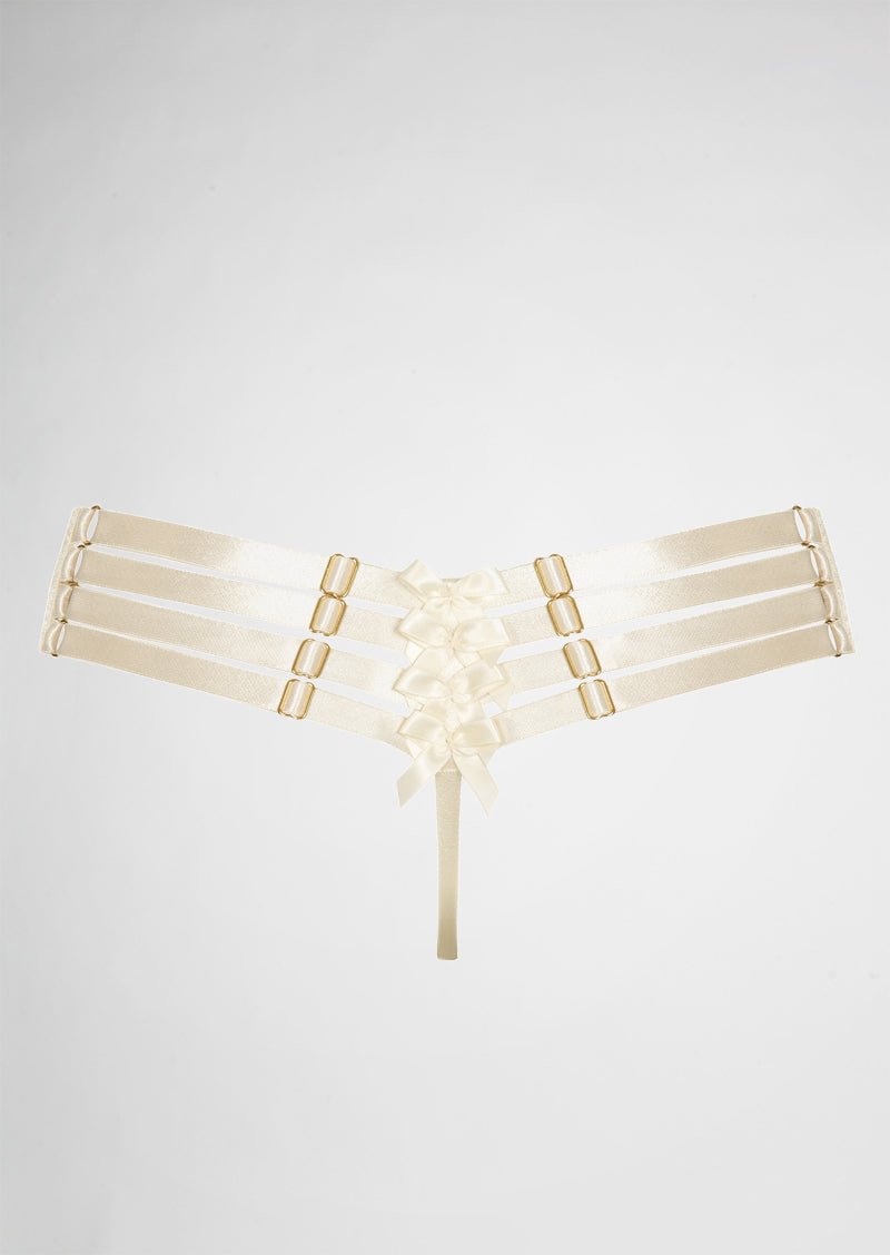 The Bordelle Adjustable Webbed Thong in Ivory is a sensational addition to your luxury lingerie collection, perfect for Bordelle addicts or your wedding day. This new take on the classic webbed thong is an ideal choice for bridal wear. Crafted for comfort and style, it features adjustable elements to ensure the perfect fit. Mix and match the thong with other Bordelle pieces to discover your favorite styling options. This panty pleasure enhances your ensemble with a touch of elegance and allure. Elevate your lingerie wardrobe with this stunning ivory piece. Our model pairs the Adjustable Webbed Thong with the Bordelle Gia Shelf Open Bra for a captivating look. Experience the perfect blend of comfort and sophistication with this exquisite thong.