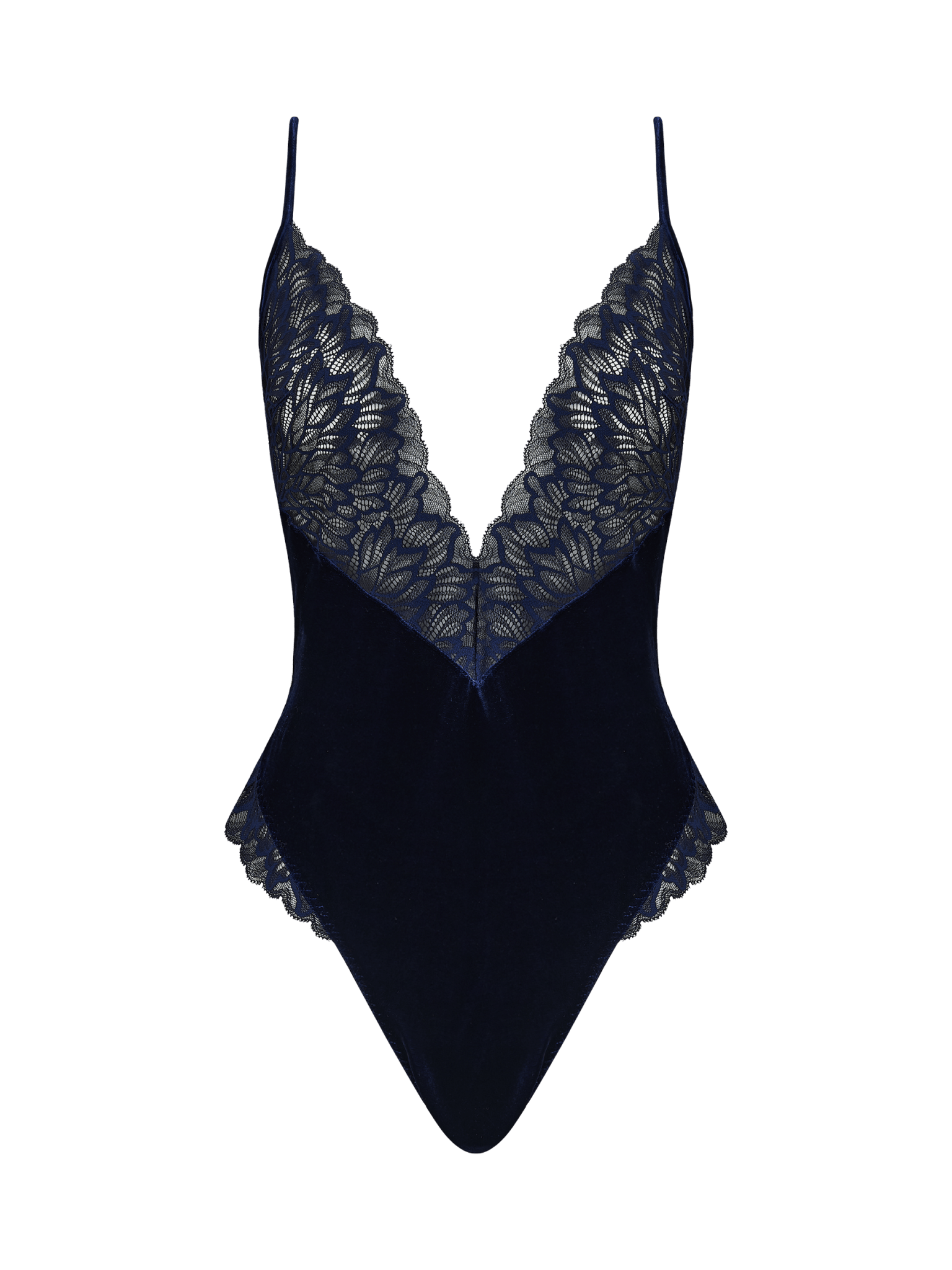 The Azzurra Bodysuit features an indulgent plunging neckline, heightened by a lace scallop edging which tantalisingly graces over the décolletage. The beautiful lace bust line meets a soft velvet form, enhanced by a delicate lace trim which playfully adorns its high leg cut. The bodysuit opens up into a breathtaking back design, drawing the eye from the shoulder straps to an indulgent scallop edging at the base of the spine. This is fastened with a delicate velvet button at the back, closing a flattering velvet-bound peephole. Every detail has been considered with perfectly positioned golden sliders, delicate adjustable strapping, and an elegant velvet thong shape, allowing the piece to slip seamlessly under any outfit.
