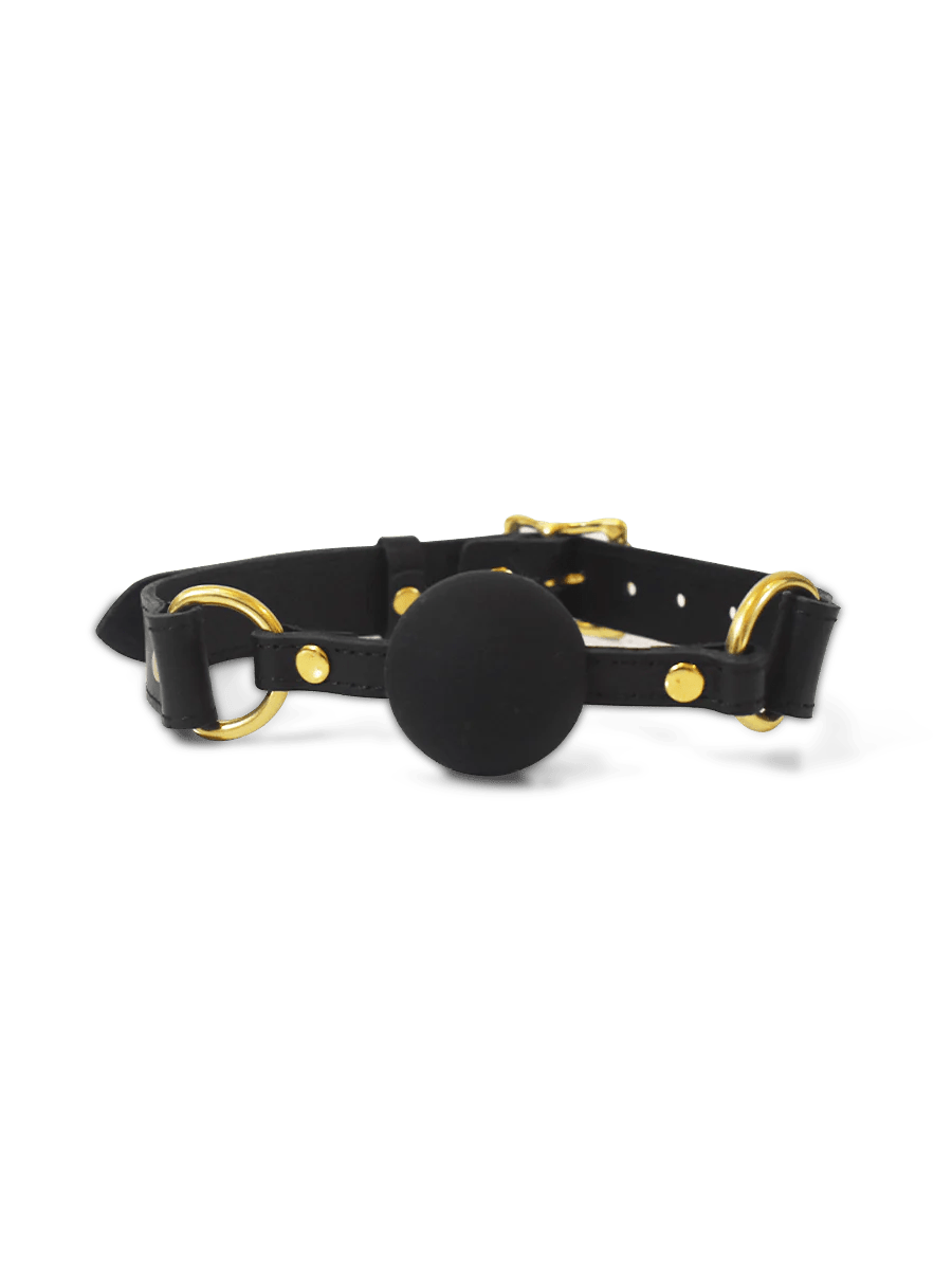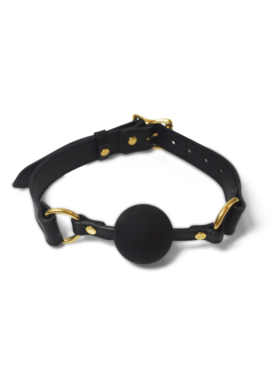Elite eroticism awaits with this premium black leather and silicone ball gag. Crafted from sumptuous cowhide, butter-soft leather, and strong brass hardware, it promises unbridled passion. Perfect for advanced restraint play, the 10-hole buckle adjusts between 16 to 23 inches, and the 5.4-inch silicone ball ensures complete submission. Packaged with a drawstring storage bag and care instructions, this exquisite piece ensures lifelong enjoyment. Coco de Mer's luxurious bondage collection offers visual and tactile delights, inspiring exploration and ultimate pleasure.