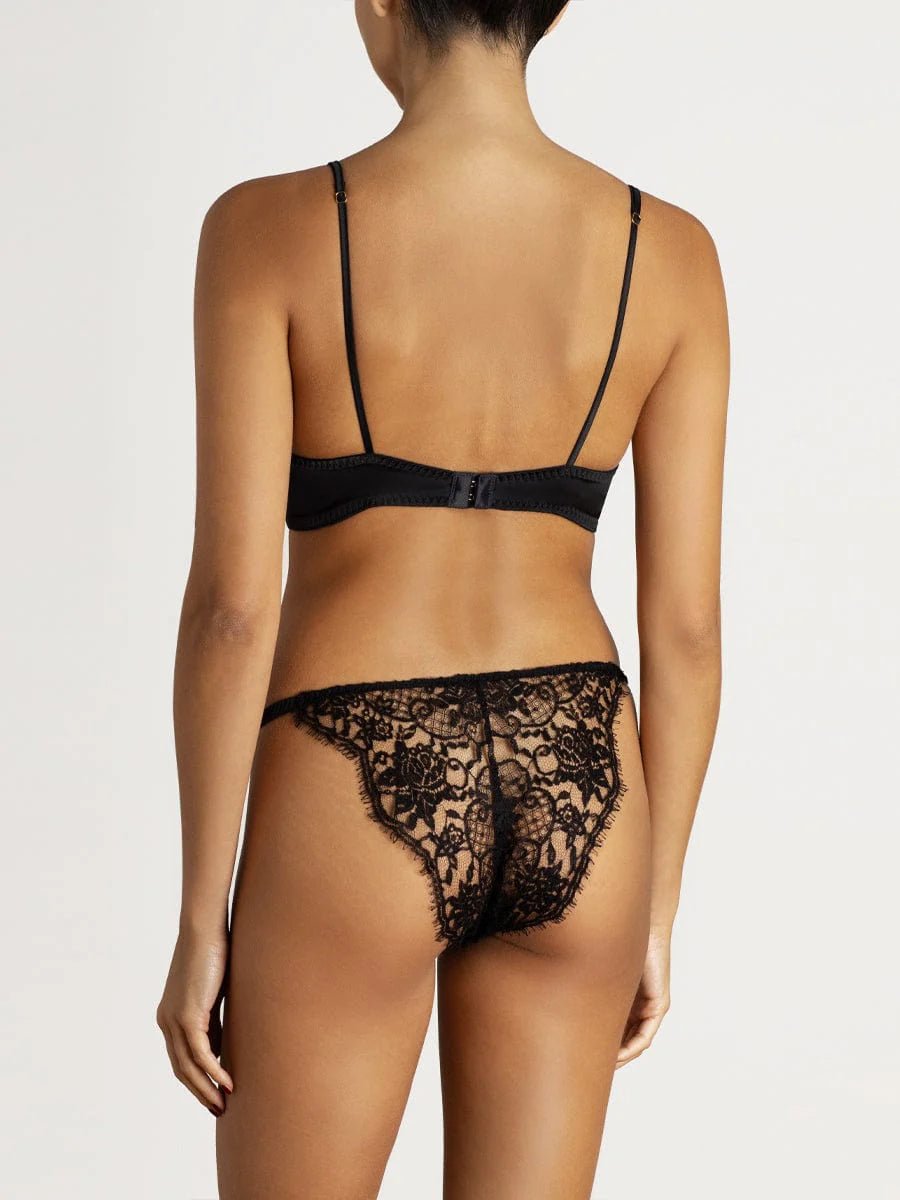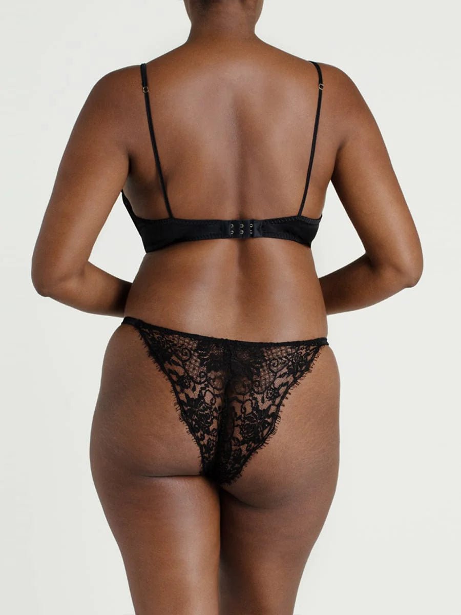 The Hera Brazilian Knicker is a classically enticing cut, delightful to wear and enthralling to see. A majestic framing of French Leaver’s lace and soft silk create an instant delight. The smooth line of the lace gently caresses the cheeks. Sitting low on the hip and high on the leg, the Hera Brazilian Knicker creates the most incredible cut to empower and entice in equal measure. Pair with the Hera High Neck Balconette Bra for unforgettable impact.