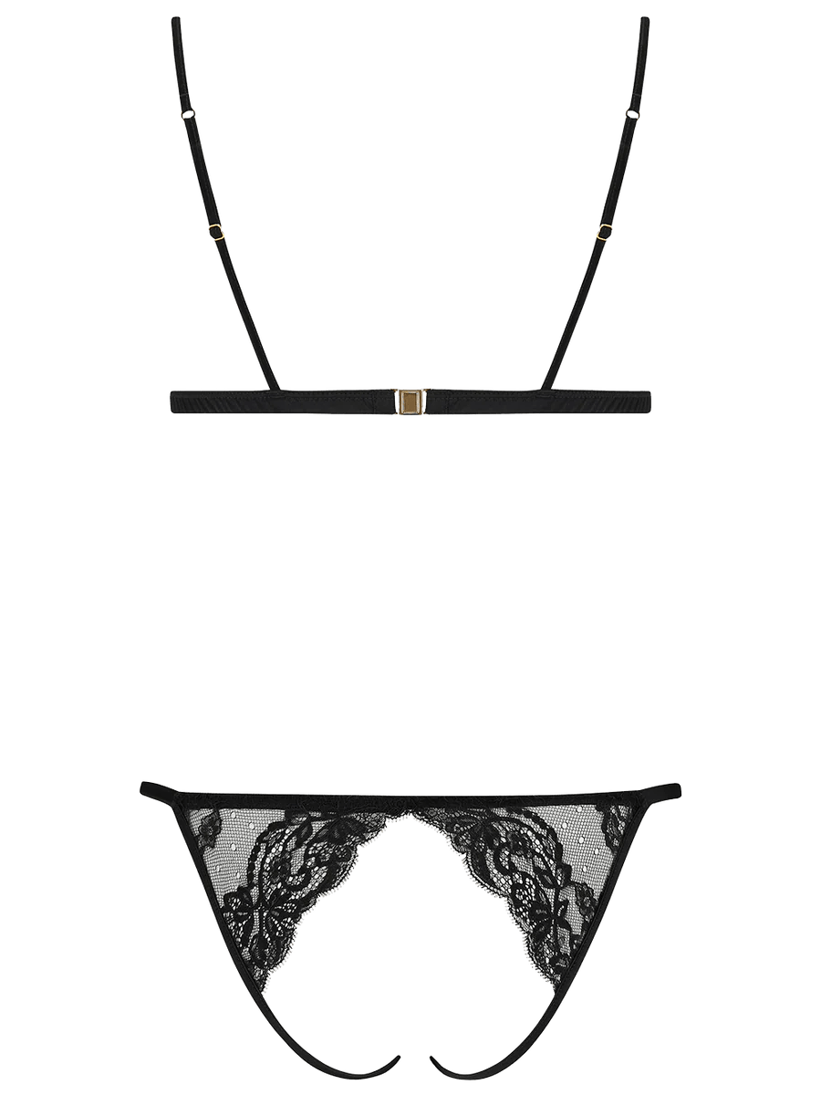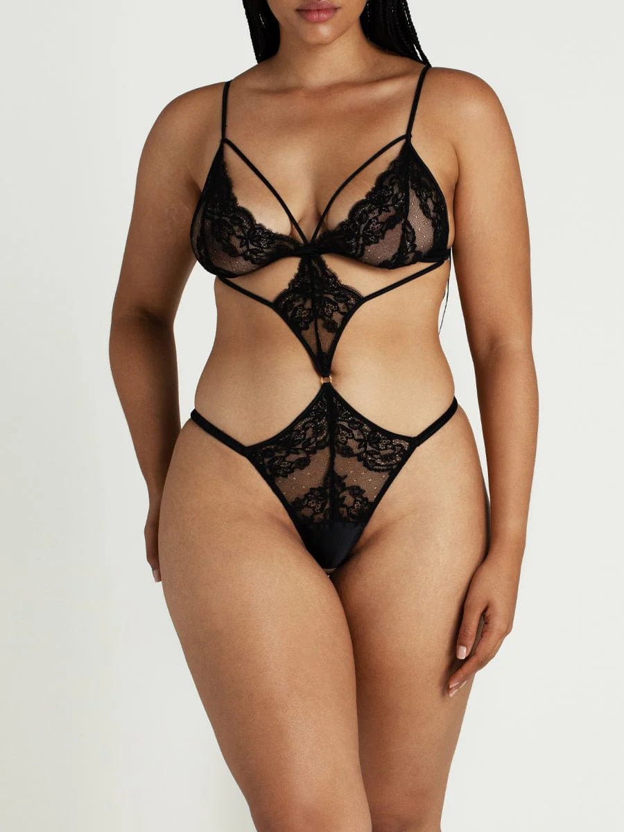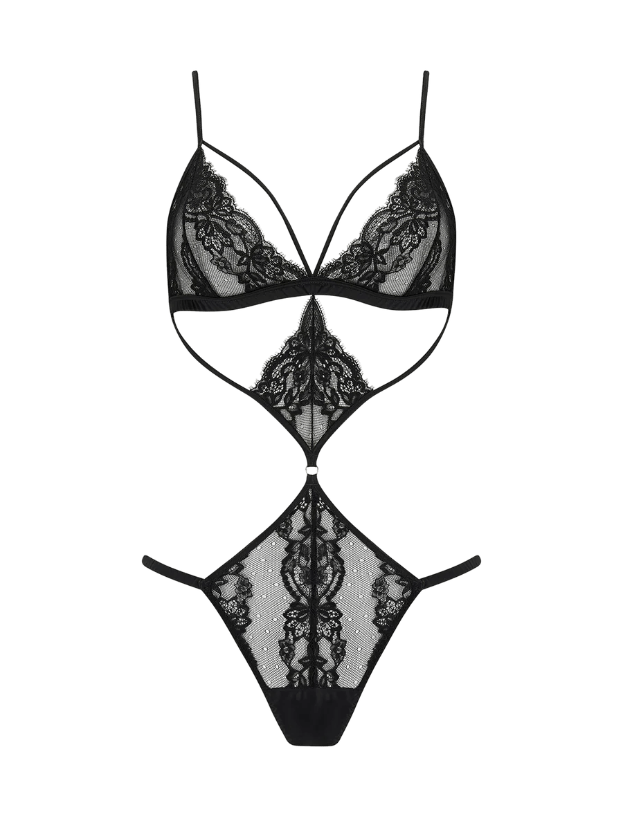 Blending elegance and erotica, the Seraphine Playsuit draws the eye irresistibly across the body. Rouleau straps weave panels of jet black French Leavers lace, enticing both sight and touch with a design that flatters your curves. The silk shoulder straps and triangle cup shape ensure delicious wearability, while the carefully placed lace conceals and reveals, drawing the eye down to the open knicker. Wearing it is a thrill; seeing it, a privilege, both creating undeniable pleasures.