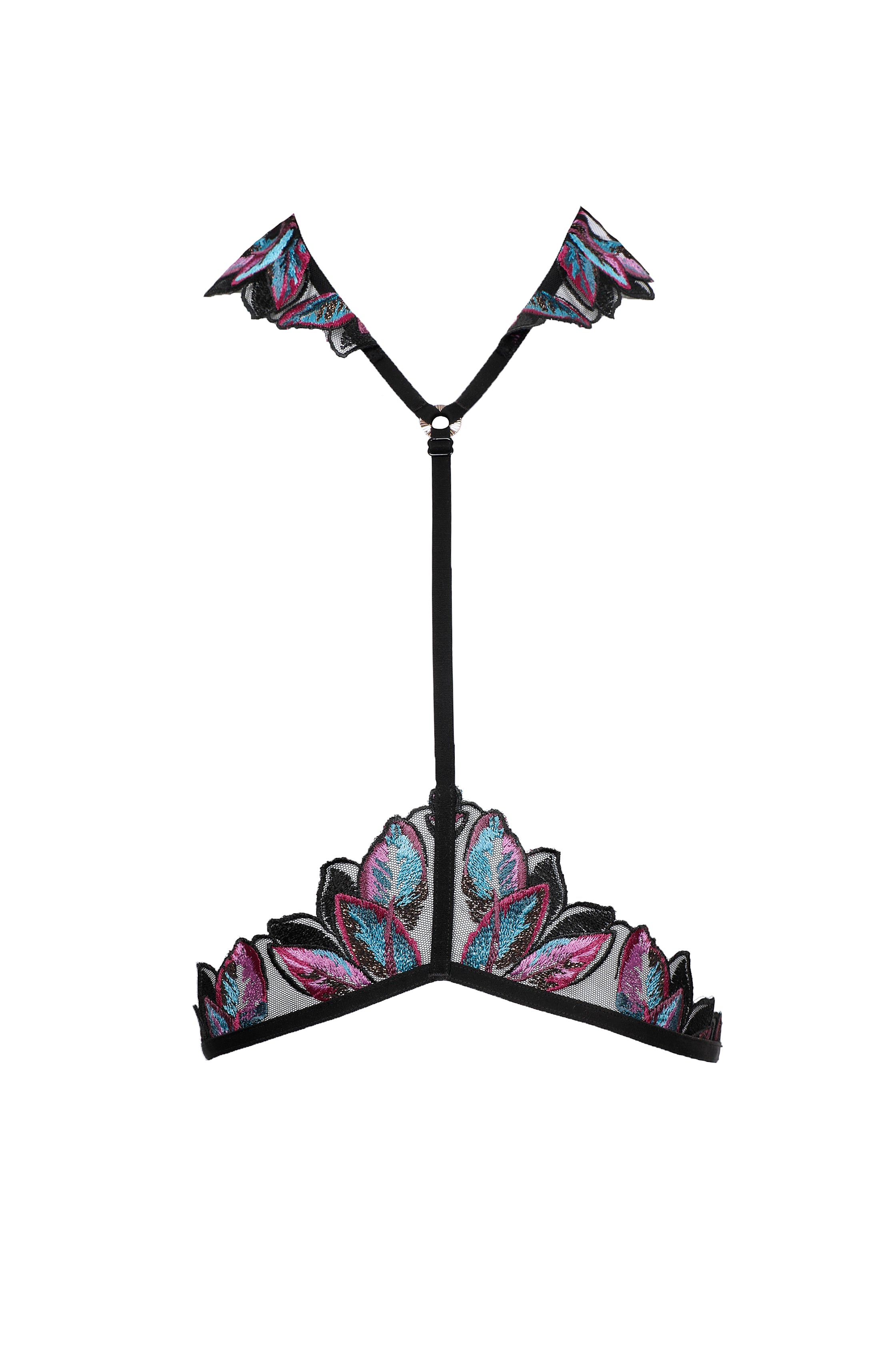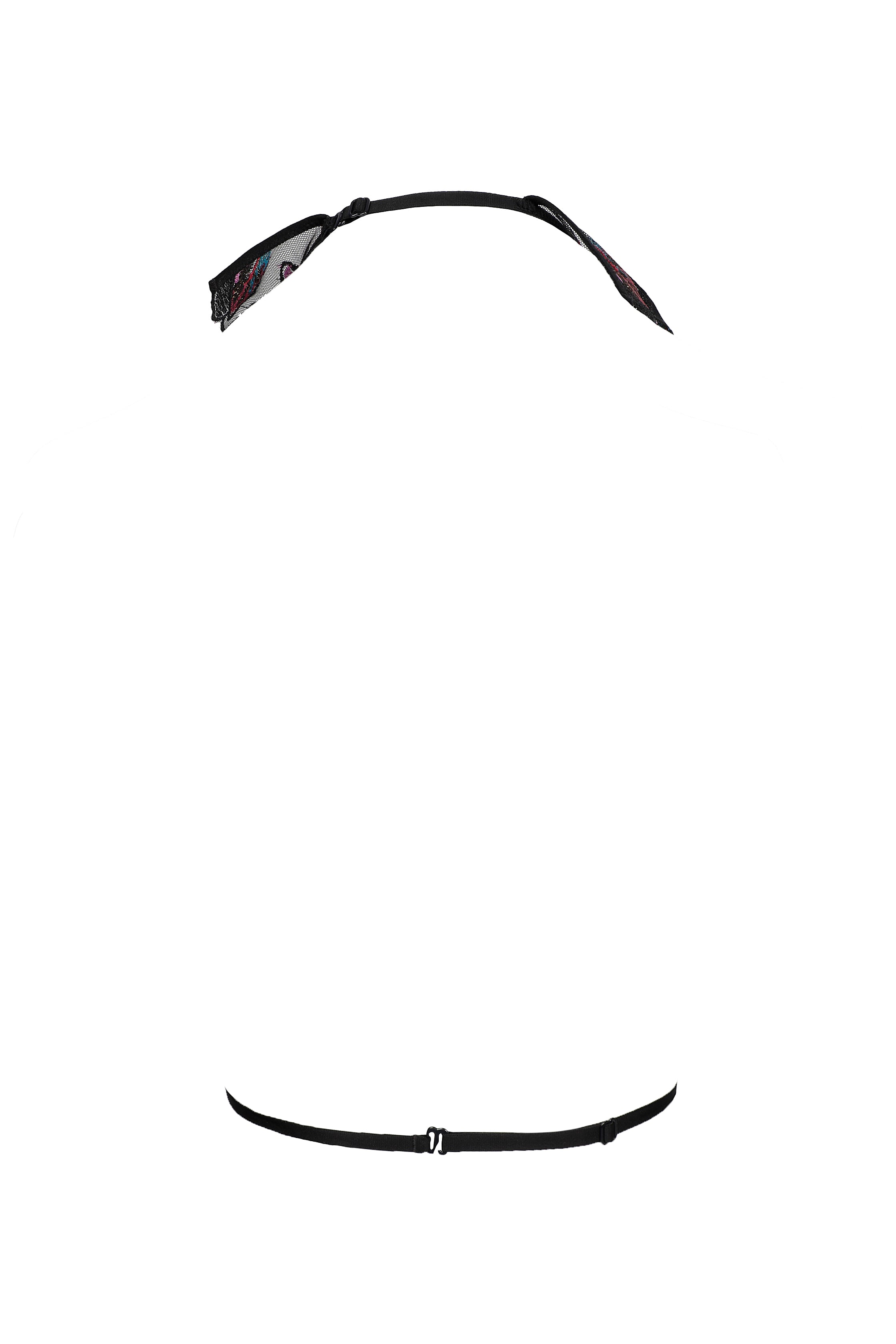 Elegant, playful and effortlessly seductive, the Oiseau de Paradis Harness in Flowered by Atelier Amour adds a bold accent to any lingerie ensemble. The embroidered yoke features iridescent multicolored floral motifs that frame the décolleté with romantic detail. Adjustable ties allow for a personalized fit and versatile styling, whether worn alone or layered with matching pieces from the collection. Sculpted gold-tone jewelry adds a luxurious finish, while the open neckline enhances the silhouette with a deep, refined plunge. Crafted from soft, sheer materials for comfort and allure. Designed to seduce, styled to bloom.