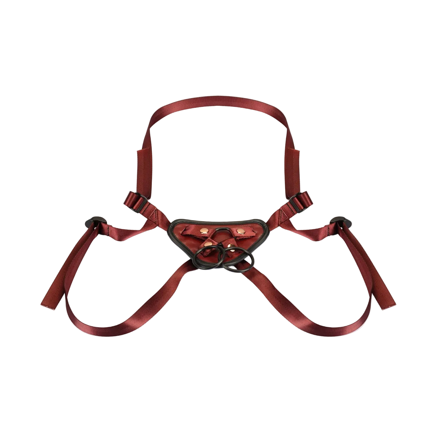 Step into a new dimension of bondage play with the Liebe Seele Wine Red Universal Leather Strap-On Harness. Crafted from premium genuine leather and finished with rose gold hardware, this elegant harness elevates your BDSM play while making a bold style statement. Adjustable buckle straps ensure a comfortable, secure fit for every body, while the soft plush-lined leather sits gently against the skin.