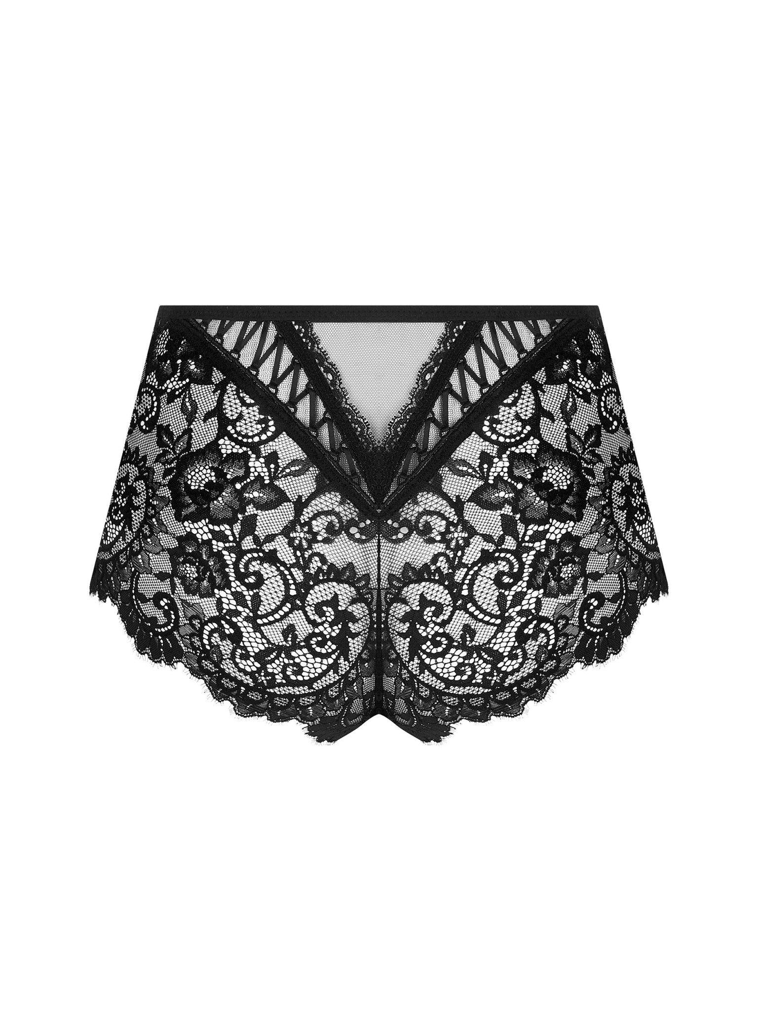 This seductive low-rise model subtly reveals the buttocks while embracing the sides. The high-waisted shorty is adorned with intricate lace at the thighs, both front and back. In the front, the design features a playful transparency with lace over tulle, enhanced by a refined ladder trim and fine lace edge. The back showcases a triangular cut-out that reveals two delicate ribbons along with a tulle triangle, framed by a fine lace border. This piece perfectly balances allure and sophistication in lingerie.