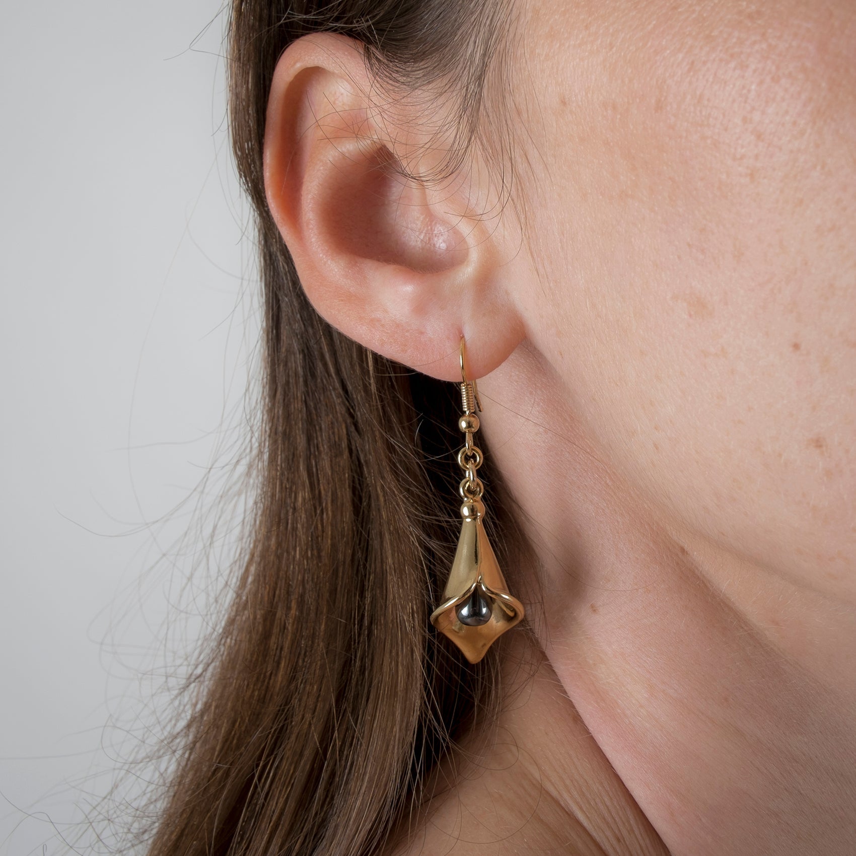 Discover the exquisite designs of Sylvie Monthulé with these elegant earrings. Two golden flowers with voluptuous stamens radiate luxury. Pearls are expertly wrapped in the nooks of lilies, capturing the magic of the moment. These earrings are gold-plated with 1 micron of 16-carat and feature a 24-carat metal finish. Adorned with hematite droplets, they add a unique touch. Additionally, they are hypoallergenic, making them safe for most skin types.