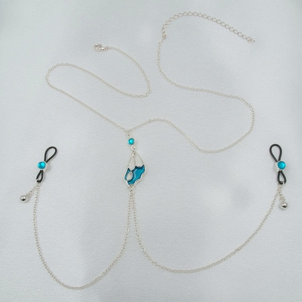 Between your breasts shines a silver butterfly wing adorned with a thousand blue sparkles. As silky-soft as a petal, it caresses your skin with pleasure! Below, two delicate silver chains sensually and playfully glide down your décolleté, embracing your erect nipples while adding a blue glow, like a drop of nectar... A nipple chain without piercing that boldly combines eroticism and elegance! Thanks to the adjustable neck chain, you can perfectly customize your nipple chain. It is plated with 10 microns of silver on metal, featuring blue enamel, fine chains, and blue stones. Hypoallergenic, with non-penetrating, painless, and sliding attachments, making it suitable for all nipple sizes.