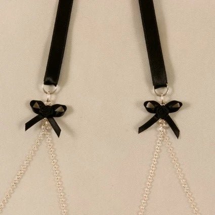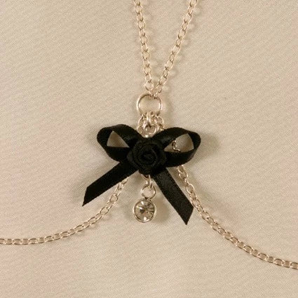 Take a bold leap and embrace your beauty with our "Satin Night" bra jewelry in silver. This open bra adornment, made from silver chains and satin ornaments, will embellish your bust with eroticism. The adjustable black satin straps, petite bows, and a crystal pendant add femininity to this sexy "topless" bra. Hypoallergenic and fully adjustable for ultimate comfort and confidence. Please note: for hygienic reasons, this item is non-returnable.